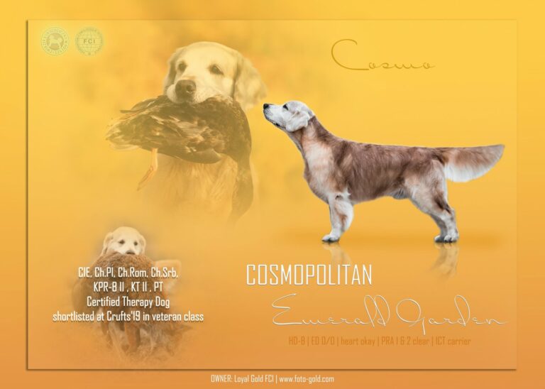 19 lipca 2011 roku nadeszła chwila w której spełniło się moje największe marzenie – zamieszkał z nami prawdziwie złoty Golden Retriever. Taki w jakim się zakochałam gdy pierwszy raz ujrzałam psa tej rasy. Wiele lat oczekiwań i selekcji hodowli wreszcie zostały wynagrodzone. Pieszczotliwie wołamy go Cosmaty a znajomi twierdzą, że jest moim ‘kosmosem’. Pewna pani powiedziała hodowcy Cosma ‘marzę, żeby mój mąż choć raz spojrzał na mnie tak jak ten pies patrzy na nią’. Prawdziwie złoty nie tylko z wyglądu ale i z charakteru. W każdym calu jest spełnieniem moich marzeń. Mój przyjaciel, mój nauczyciel, mój ideał. Piętaszek z pełnymi miłości oczami i wiecznie rozmachaną kitą. Niezawodny sposób na poprawę humoru. Wiecznie wlepione we mnie pełne gotowości spojrzenie. Cierpliwość ubrana w futro. Anioł dla dzieci, egoista dla kumpli w parku, niezastąpiony ojciec i wujek wszystkich szczeniorów, plac zabaw dla kotów. Pies myśliwski bez ‘nosa’ ale urodzony aporter wszystkiego począwszy od kijków i aportów idąc przez gazety, kończąc na skarpetkach. W wolnych chwilach wielki filizof i ‘Pan Zawias’. Degustator jabłek. Najwierniejszy towarzysz, taki przy którym wiesz, że stwierdzenie “za Tobą skoczę w ogień” jest w stu procentach prawdziwe. Wszechstronny w spełnianiu moich zachcianek tych wystawowych, szkoleniowych, jak i tych wziętych z kosmosu. Urodzony model, najlepszy pies fotografa. Czasami kompletnie niezrozumiały i zaskakujący. Taki po prostu mój Ninuśsynek,robiący wszystko żeby zadowolić Pańcię 🙂